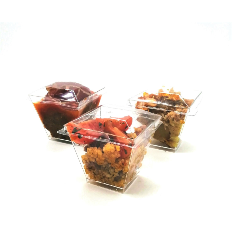 Verrines salées pour vous ouvrir l'appétit et présentées dans des verrines en plastique transparent.